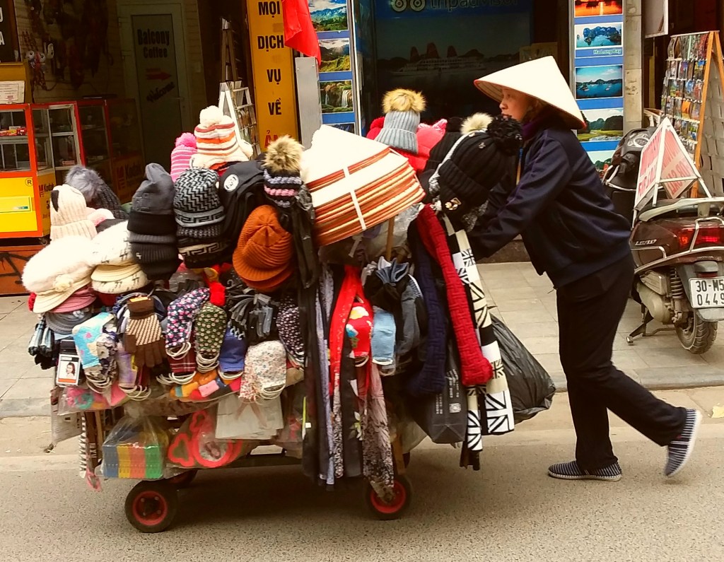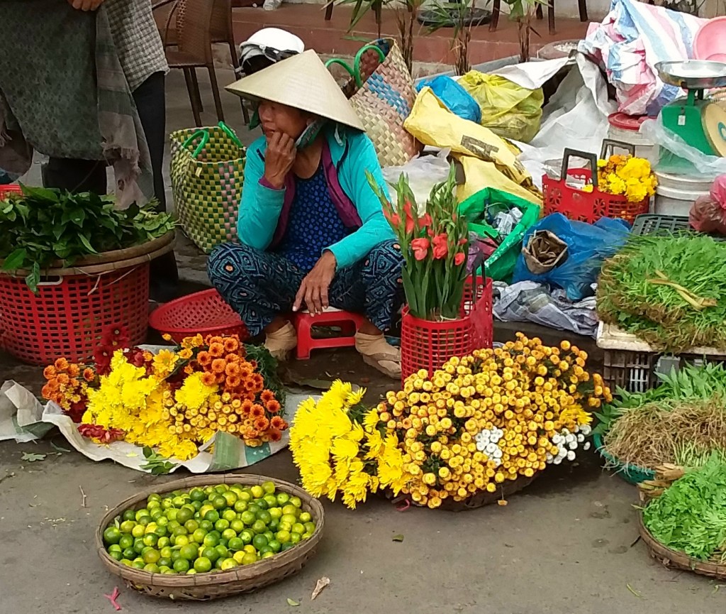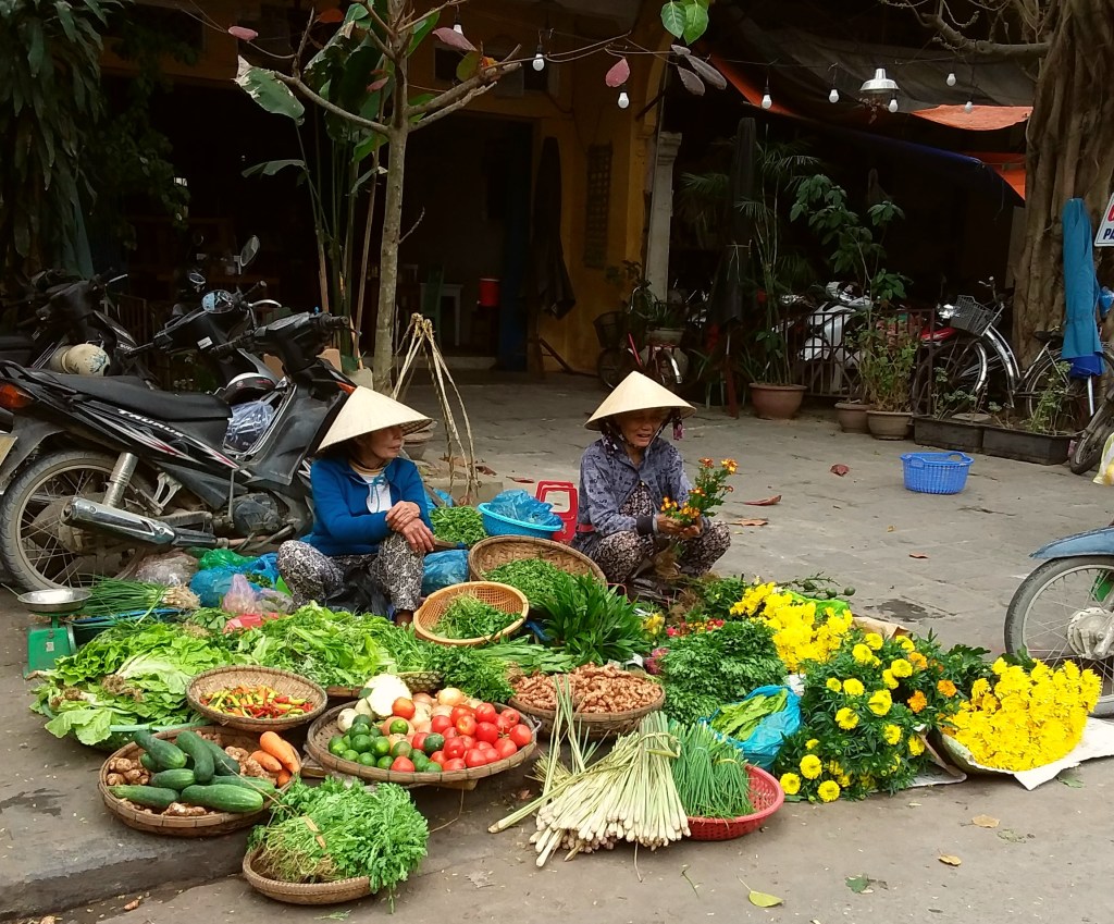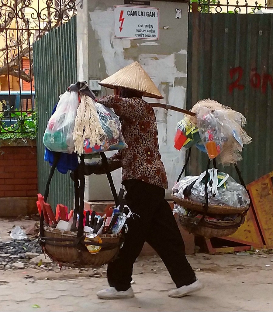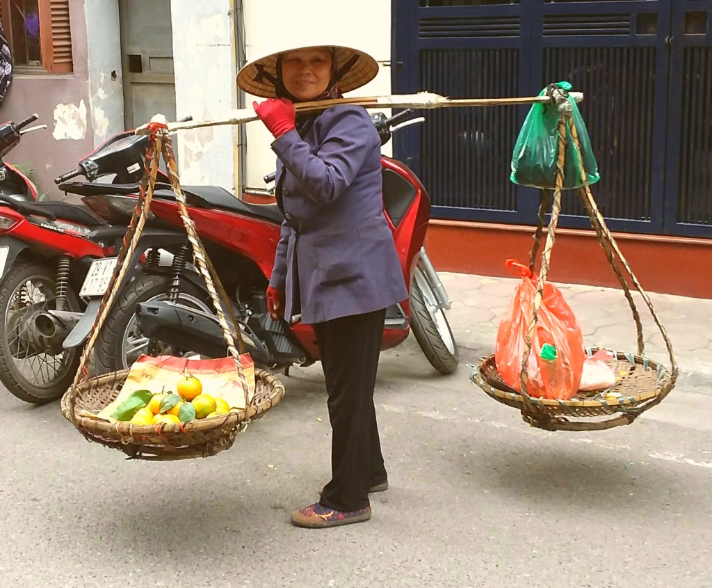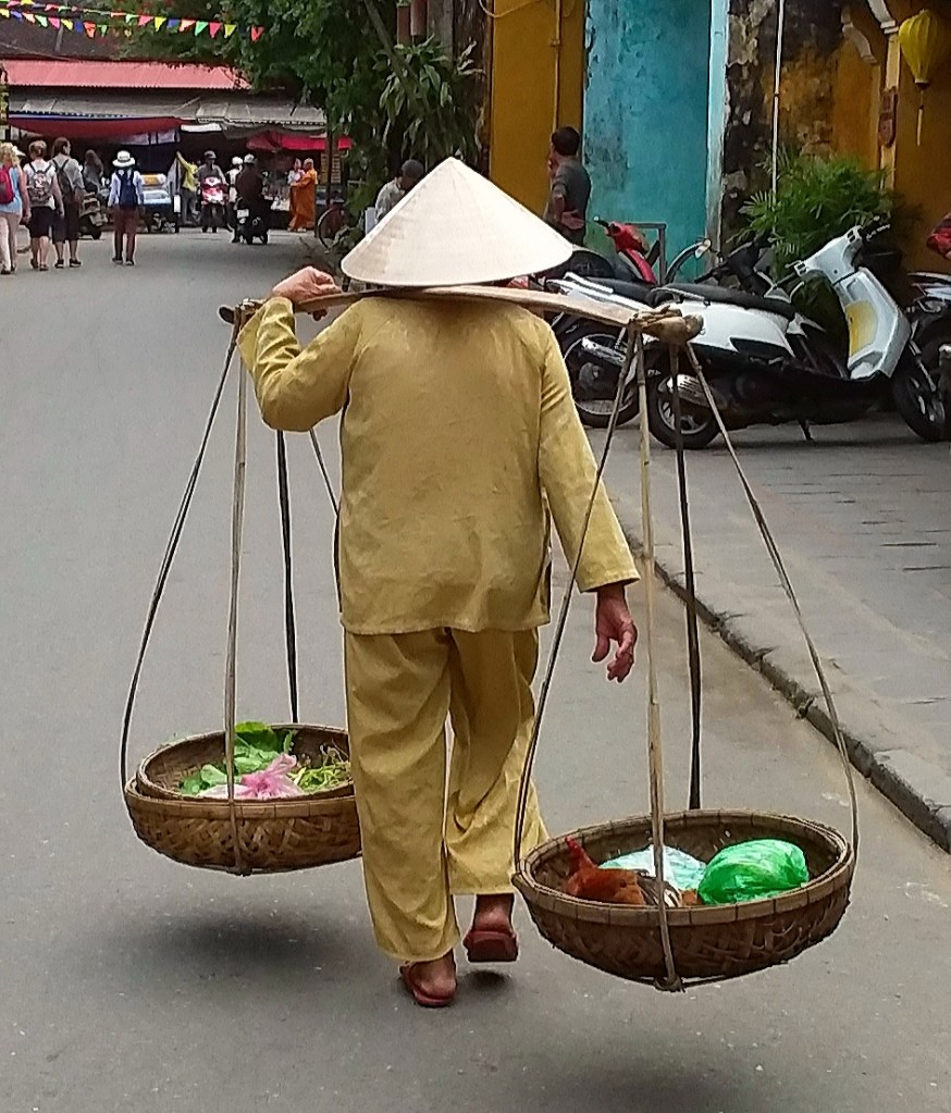 While traveling through Vietnam I saw hard-working women everywhere. Many were riding bicycles or scooters packed with merchandise. Some were pushing unbelievably heavy carts overfilled with goods for the daily market. I saw many women in the market preparing vegetables, fruits, and flowers for customers. In one town I watched women cutting bamboo strips and weaving them into baskets. On nearly every street there were women walking with “carrying poles” across their shoulders to display their products. Our tour group met with women who work long hours weaving blankets with traditional tools. And, we saw first hand that tour guides spend days away from home showing travelers the history, culture, and beauty of Vietnam. It certainly appears that Vietnam’s women are a major part of each city’s local economy.