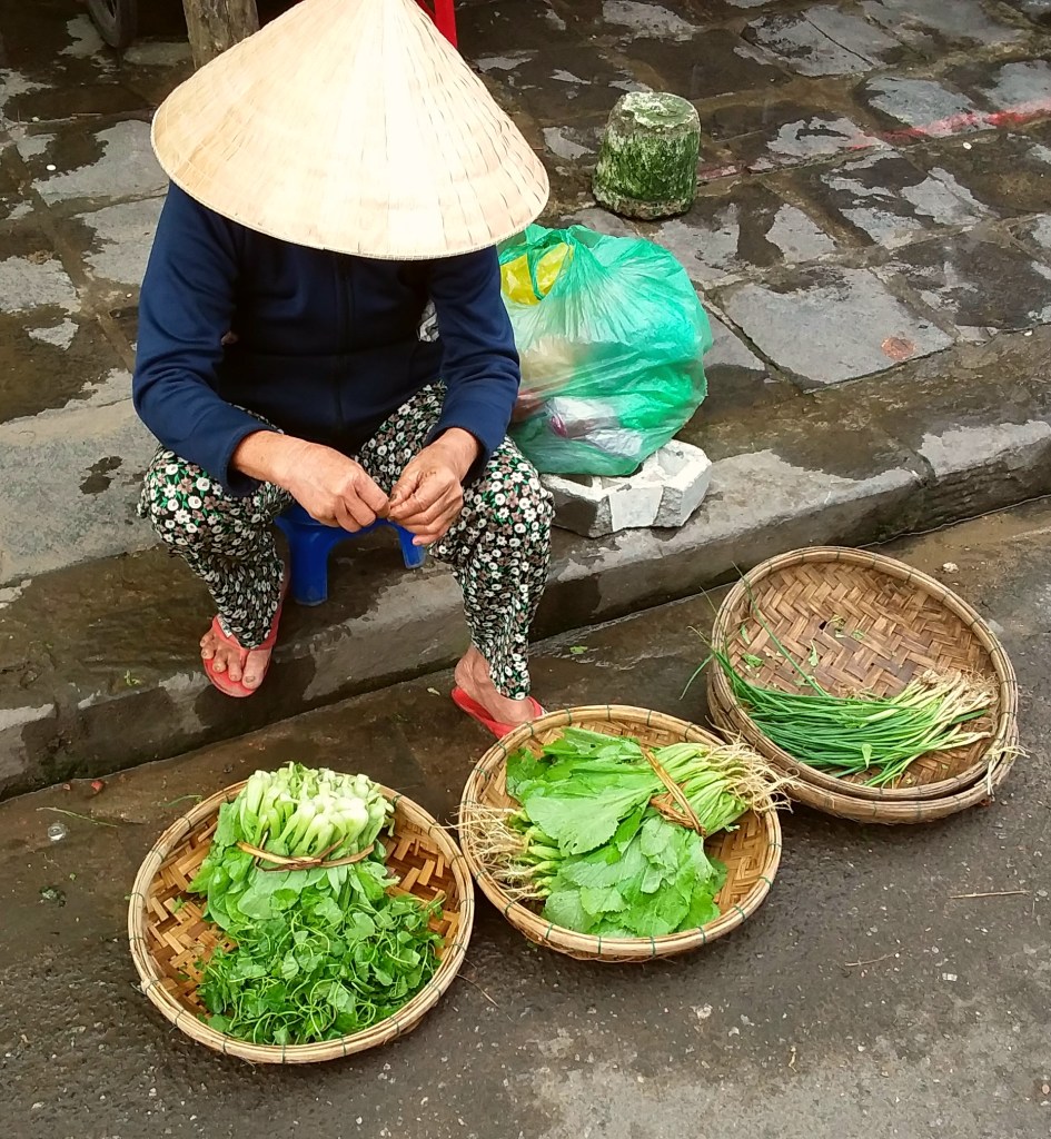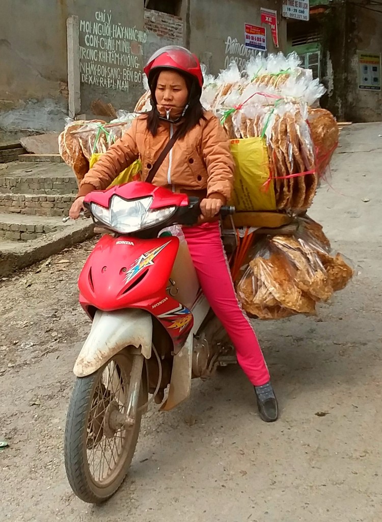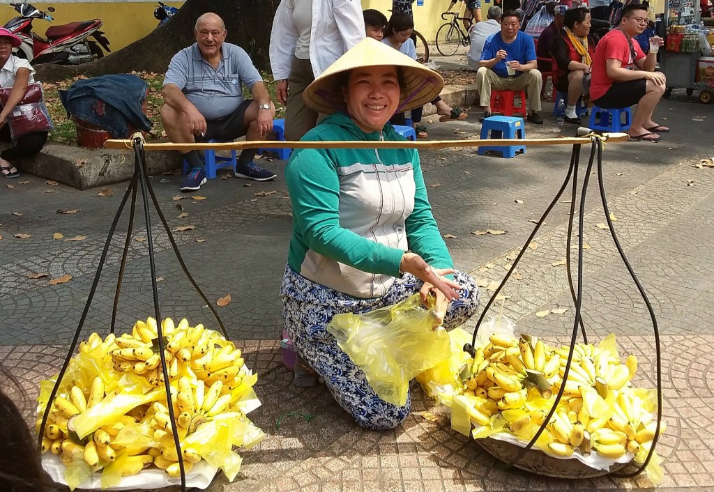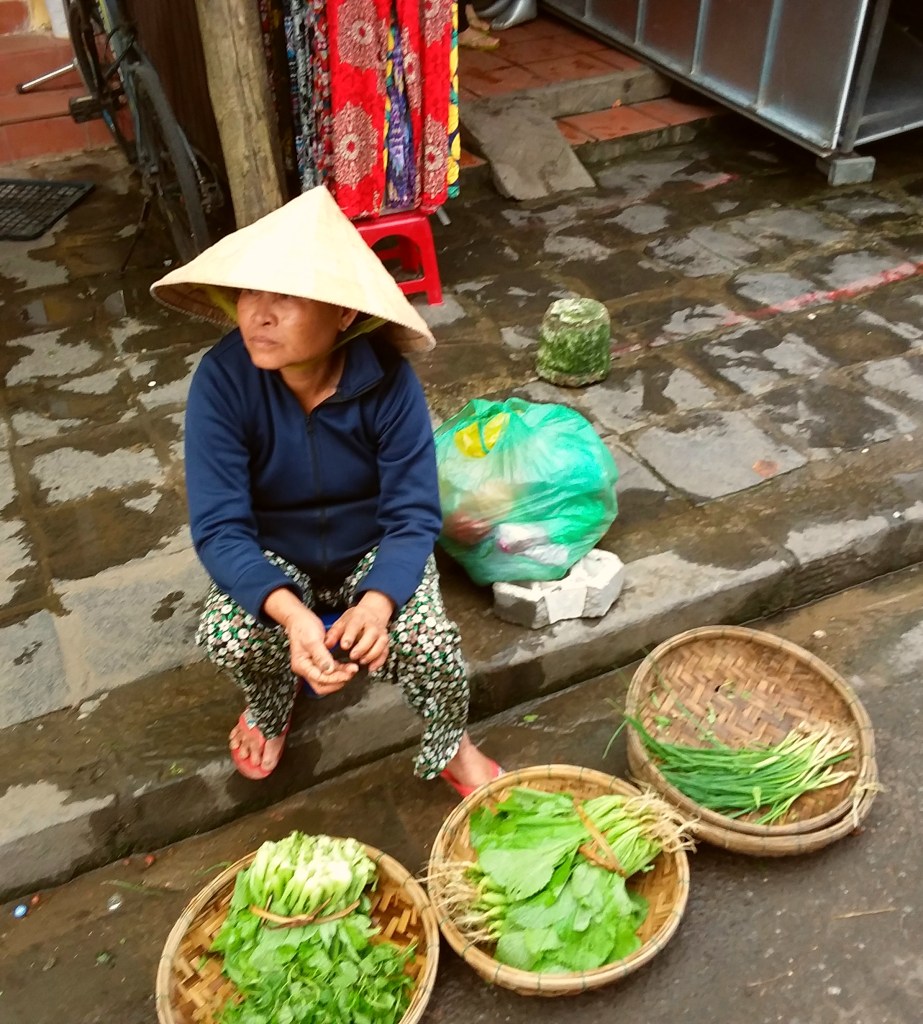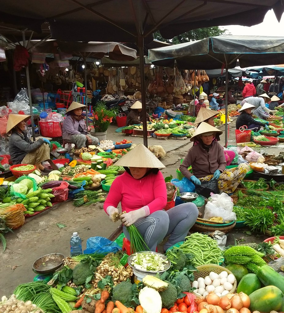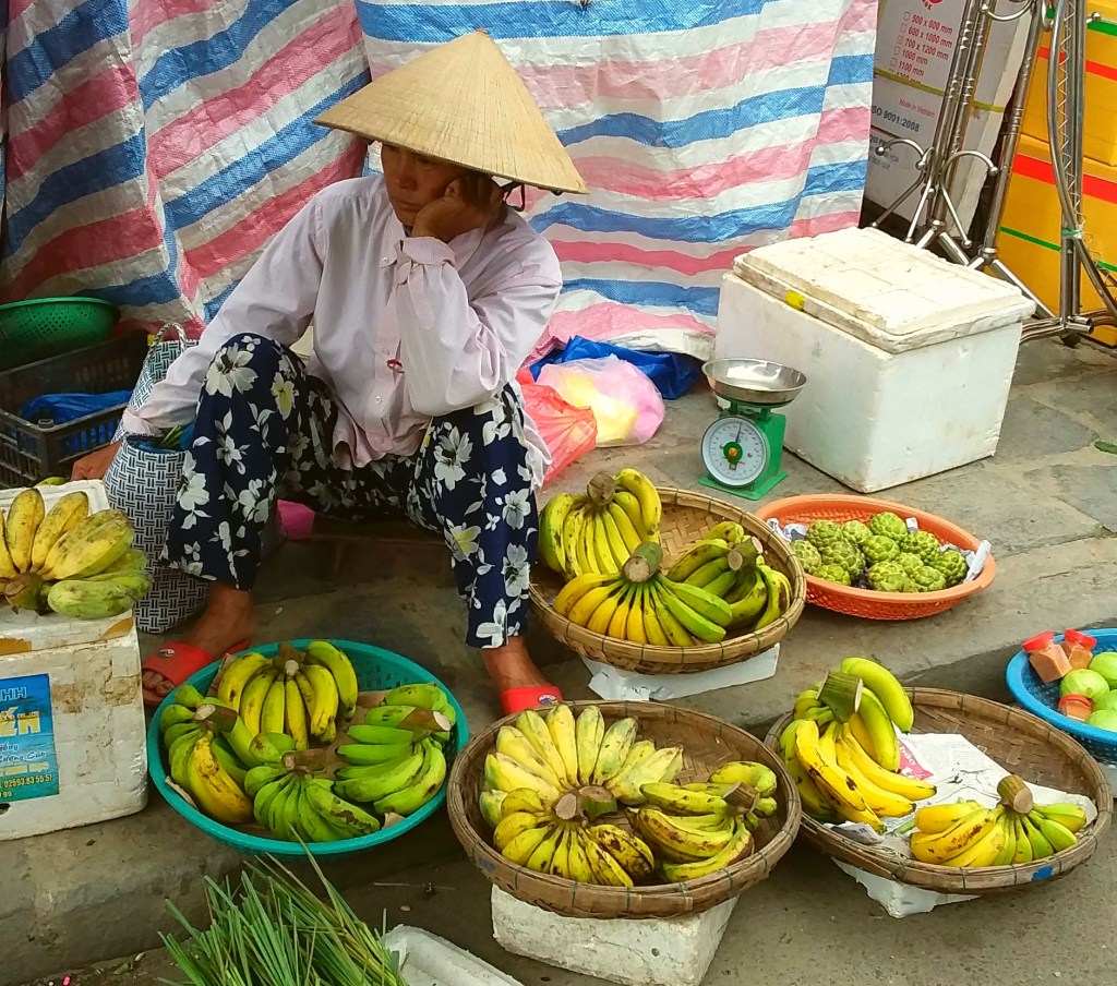 While traveling through Vietnam I saw hard-working women everywhere. Many were riding bicycles or scooters packed with merchandise. Some were pushing unbelievably heavy carts overfilled with goods for the daily market. I saw many women in the market preparing vegetables, fruits, and flowers for customers. In one town I watched women cutting bamboo strips and weaving them into baskets. On nearly every street there were women walking with “carrying poles” across their shoulders to display their products. Our tour group met with women who work long hours weaving blankets with traditional tools. And, we saw first hand that tour guides spend days away from home showing travelers the history, culture, and beauty of Vietnam. It certainly appears that Vietnam’s women are a major part of each city’s local economy.