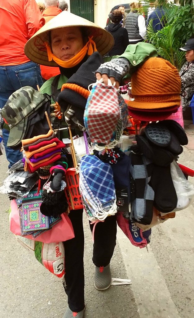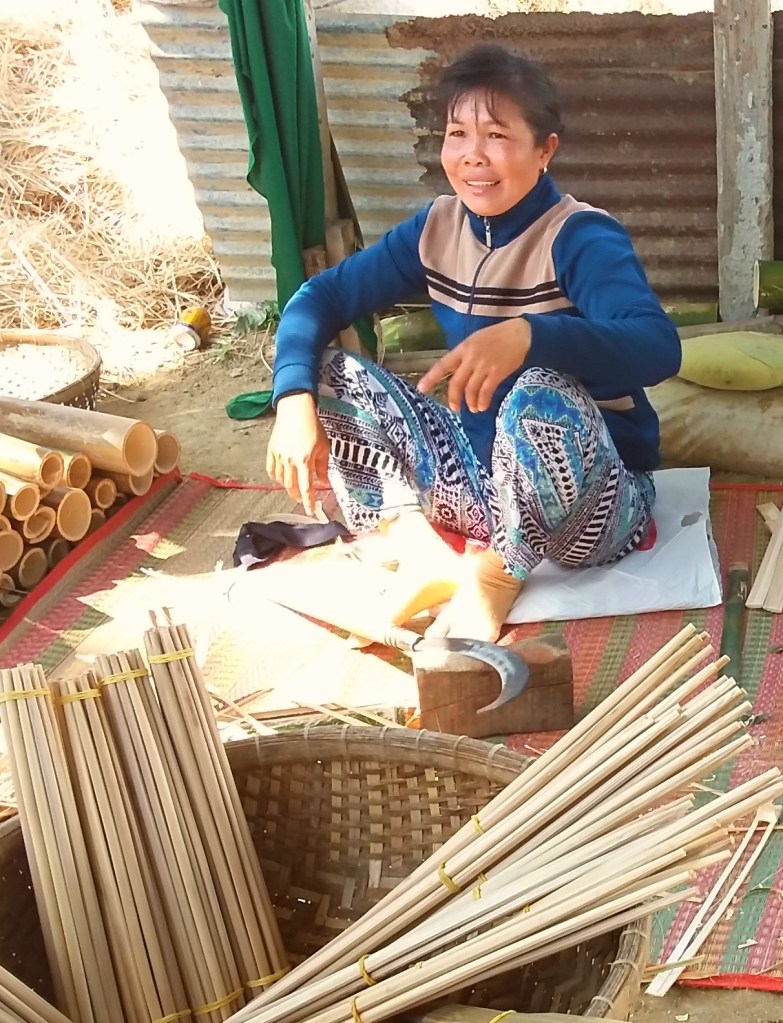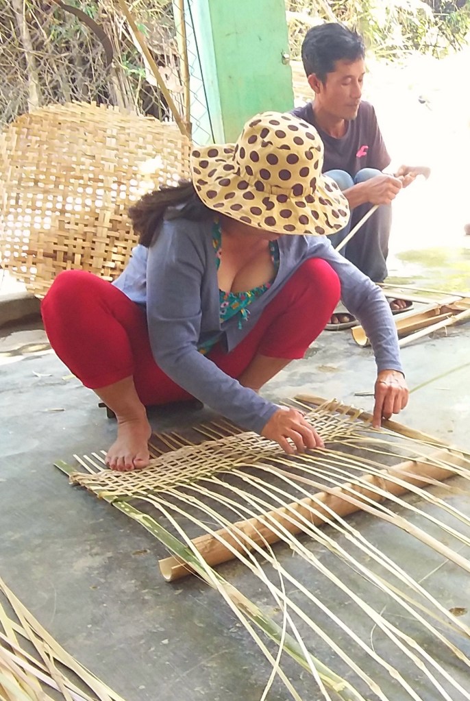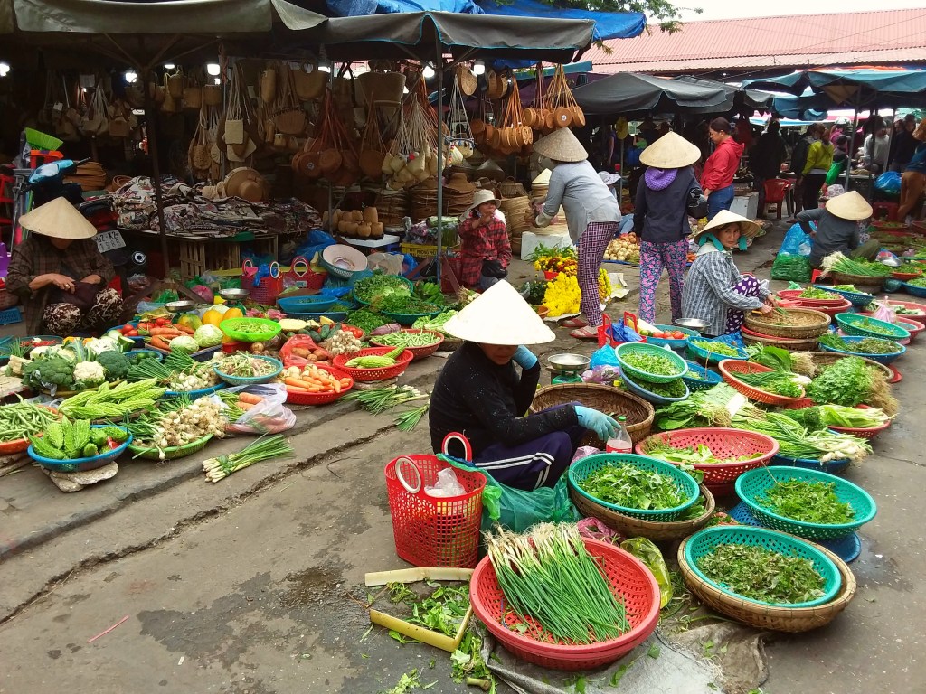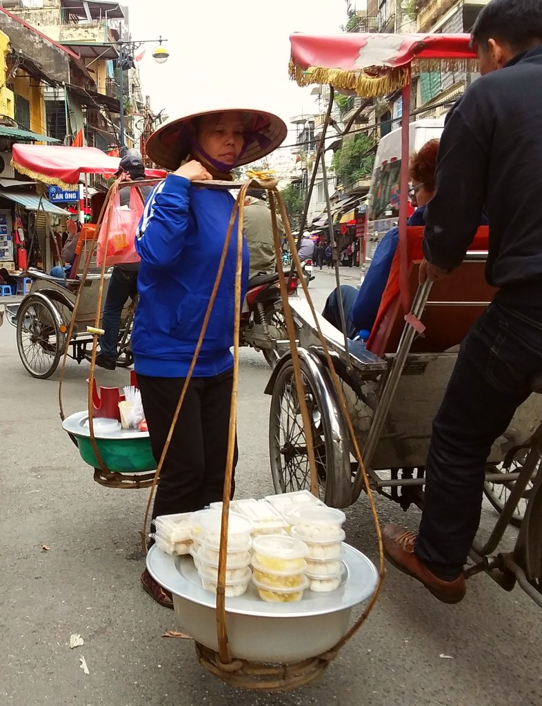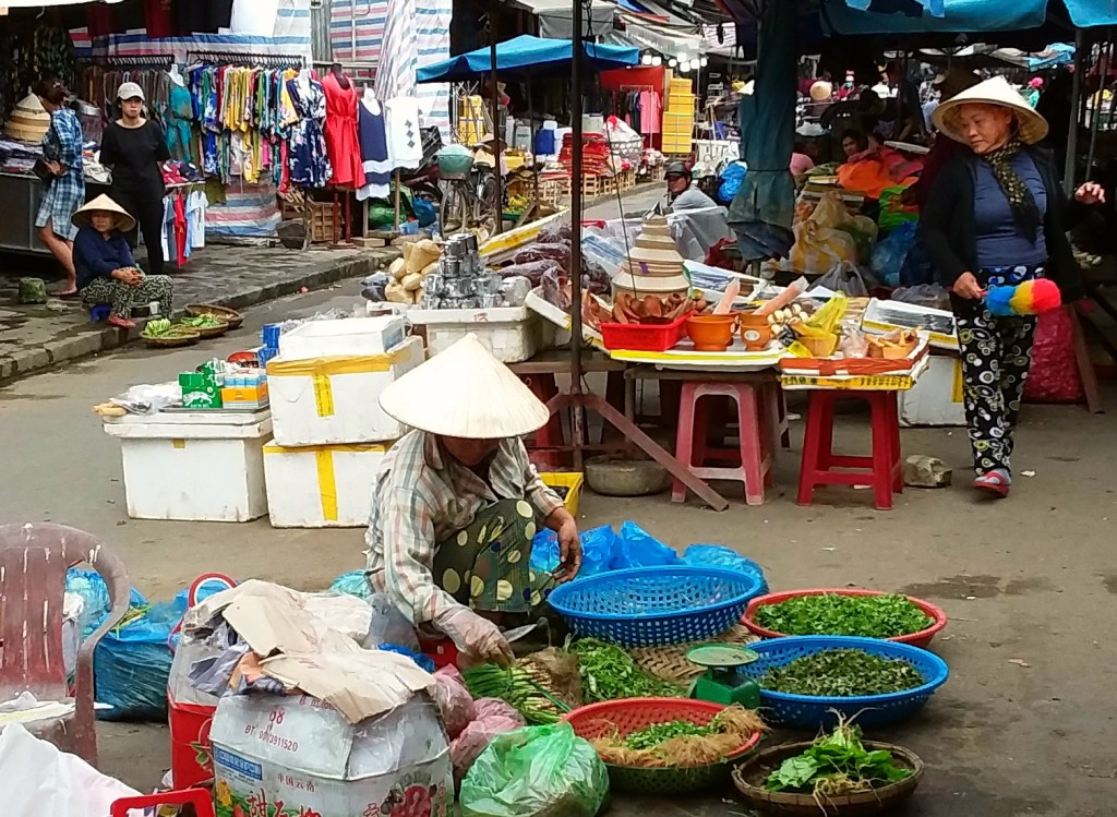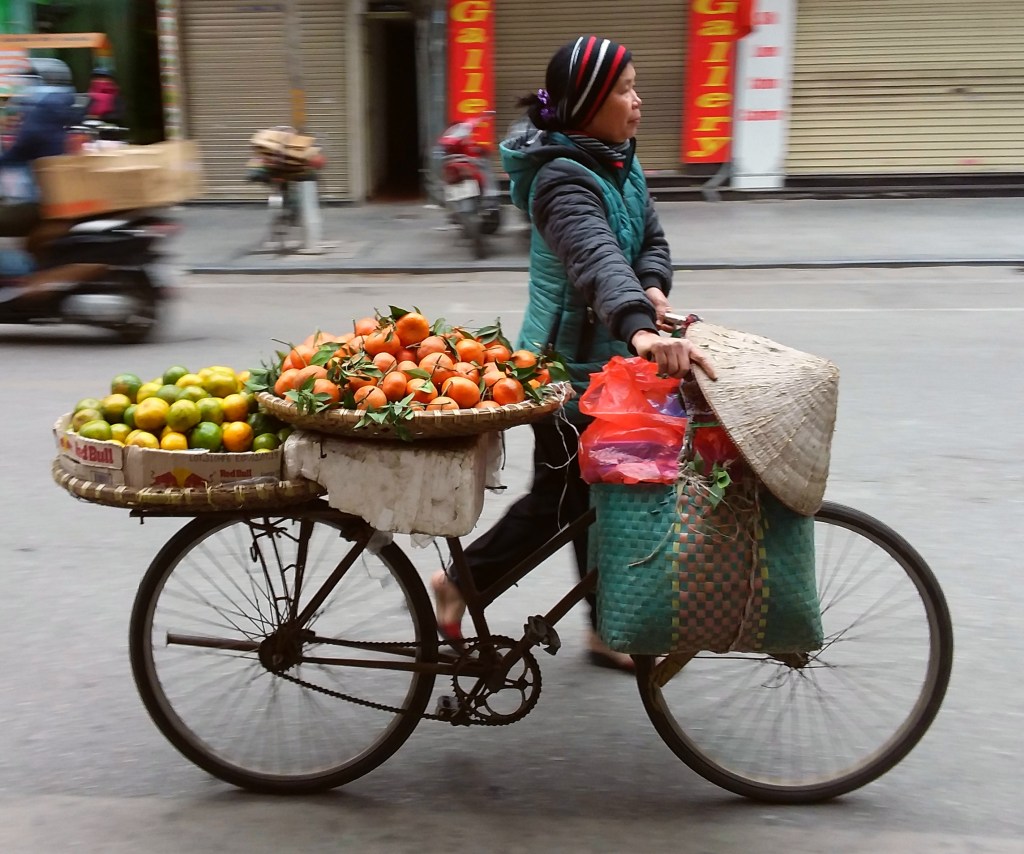 While traveling through Vietnam I saw hard-working women everywhere. Many were riding bicycles or scooters packed with merchandise. Some were pushing unbelievably heavy carts overfilled with goods for the daily market. I saw many women in the market preparing vegetables, fruits, and flowers for customers. In one town I watched women cutting bamboo strips and weaving them into baskets. On nearly every street there were women walking with “carrying poles” across their shoulders to display their products. Our tour group met with women who work long hours weaving blankets with traditional tools. And, we saw first hand that tour guides spend days away from home showing travelers the history, culture, and beauty of Vietnam. It certainly appears that Vietnam’s women are a major part of each city’s local economy.