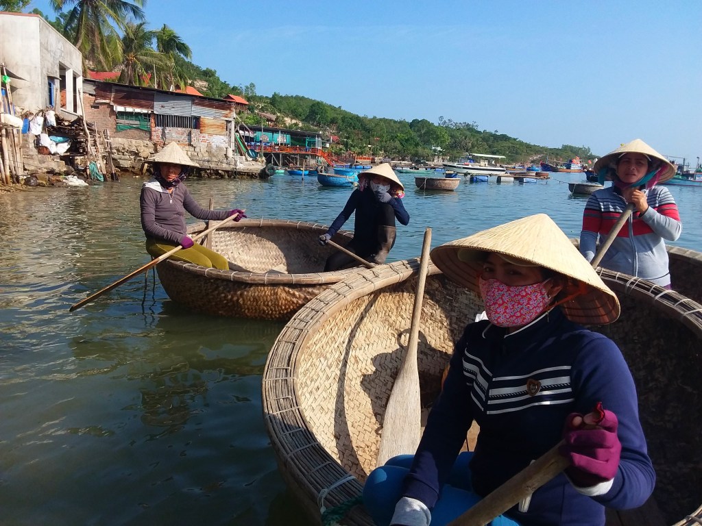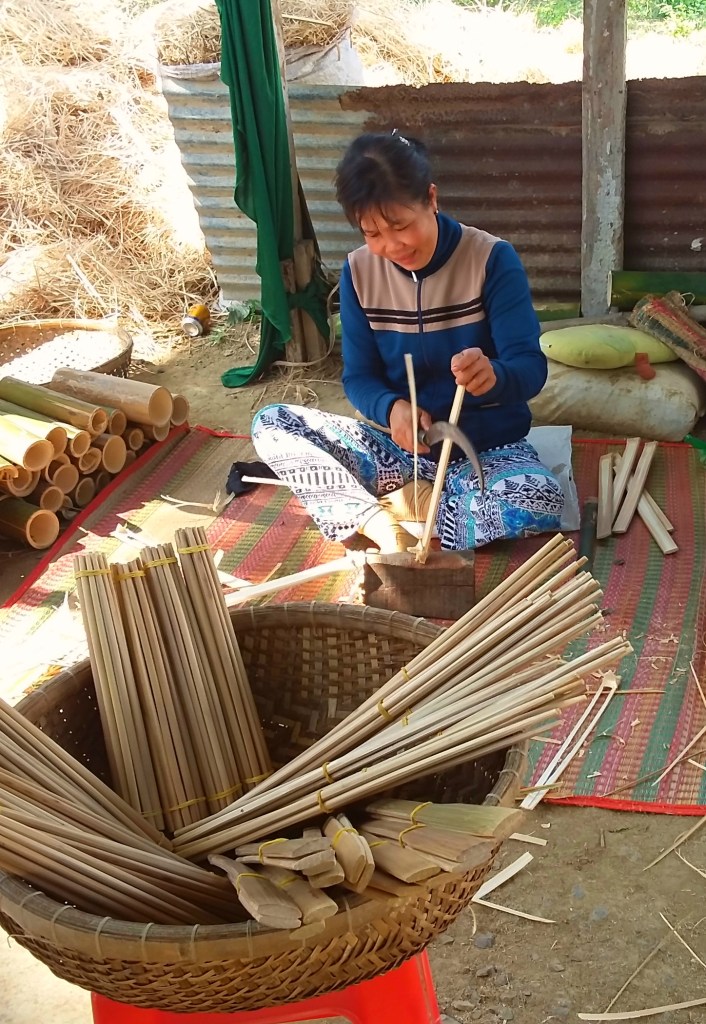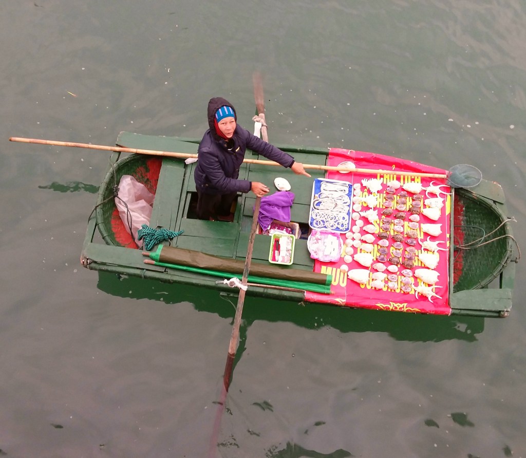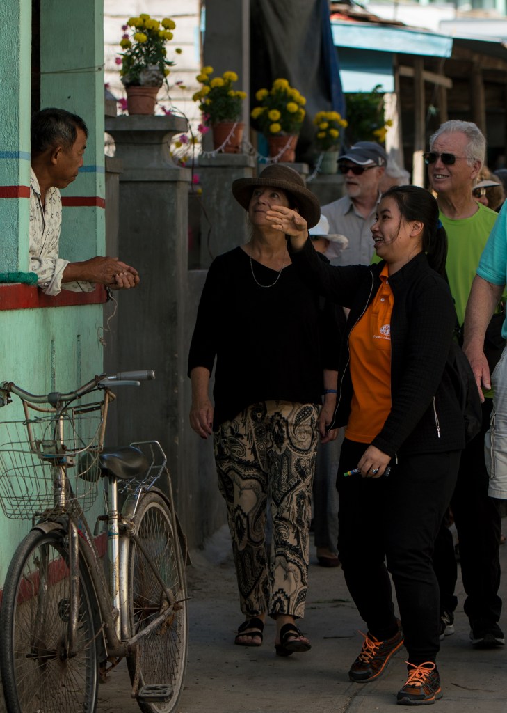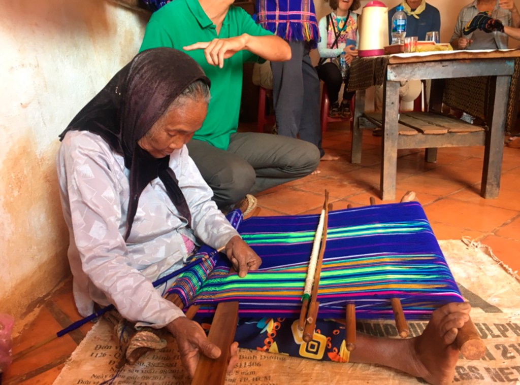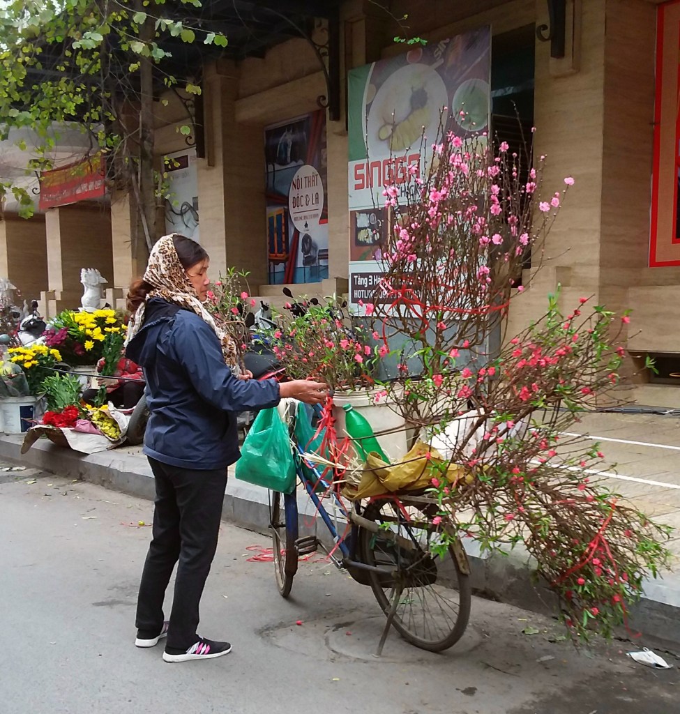 While traveling through Vietnam I saw hard-working women everywhere. Many were riding bicycles or scooters packed with merchandise. Some were pushing unbelievably heavy carts overfilled with goods for the daily market. I saw many women in the market preparing vegetables, fruits, and flowers for customers. In one town I watched women cutting bamboo strips and weaving them into baskets. On nearly every street there were women walking with “carrying poles” across their shoulders to display their products. Our tour group met with women who work long hours weaving blankets with traditional tools. And, we saw first hand that tour guides spend days away from home showing travelers the history, culture, and beauty of Vietnam. It certainly appears that Vietnam’s women are a major part of each city’s local economy.