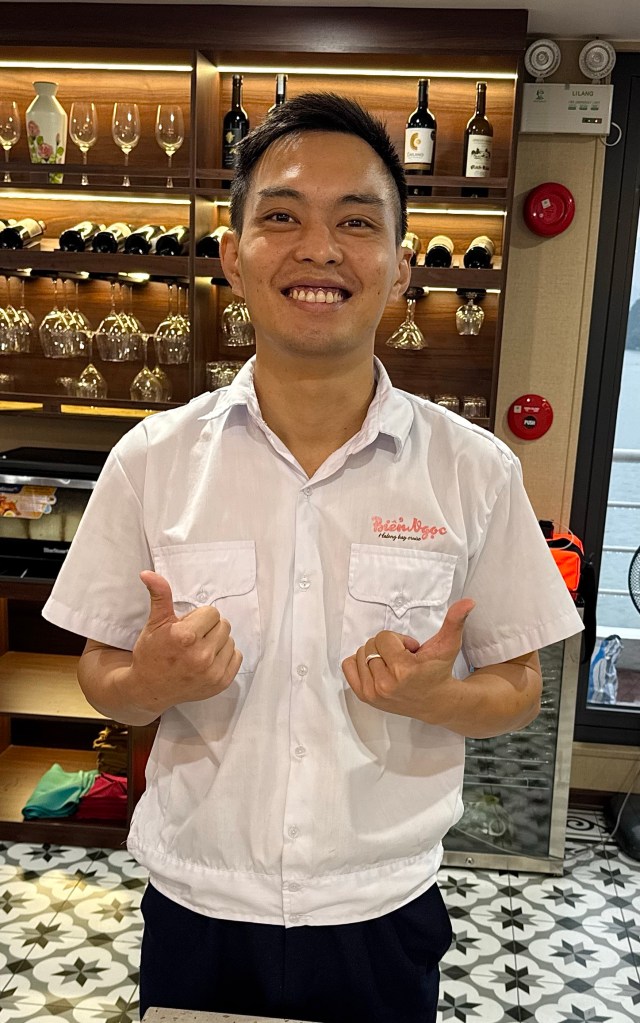 This World Heritage site has over 1000 mountain islands filled with numerous caves, beaches, and Vietnamese fishing boats floating around the bay. The crew of our Secret Halung Cruise boat was very hospitable. We received lots of smiles from the crew.
